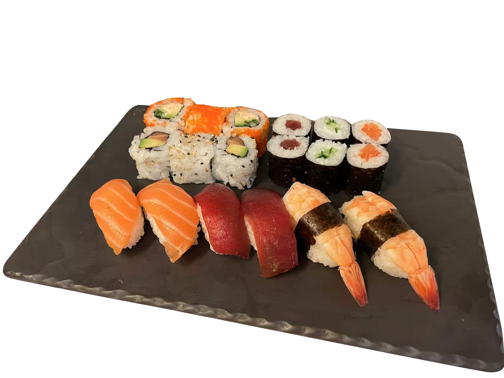 2 SUSHI CREVETTE* 2 SUSHIS SAUMON 2 SUSHIS THON 2 MAKIS THON 2 MAKIS SAUMON 2 MAKIS CONCOMBRE 3 CALIFORNIA ROLLS MASSAGO* SURIMI 3 CALIFORNIA ROLLS SAUMON AVOCAT